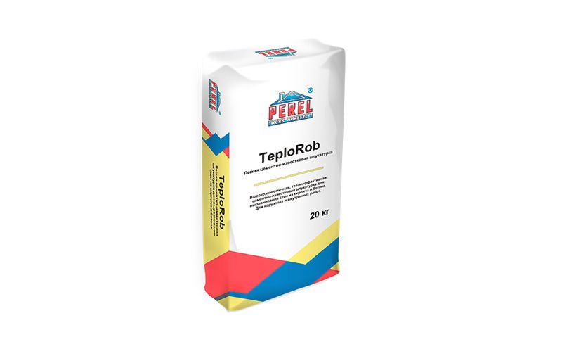 PEREL Цементно-известковая штукатурка 0518 TeploRob - легкая штукатурная смесь на основе цементно-известкового вяжущего и легкого минерального наполнителя для выравнивания стен из бетона, кирпича, газобетона, а также заделки стыков и отдельных неровностей бетонных и железобетонных плит в сухих, влажных помещениях и для наружных работ.