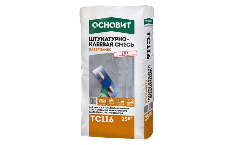 Штукатурно-клеевая смесь ОСНОВИТ КАВЕРПЛИКС ТС116 предназначена для монтажа пенополистирольных и минераловатных плит, создания армированного базового штукатурного слоя. Рекомендуется для создания “дышащих” систем утепления фасадов как новых, так и старых зданий. Применяется при устройстве системы фасадной теплоизоляции ОСНОВИТ. Для внутренних и наружных работ.